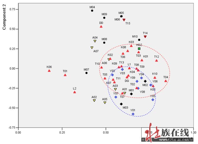 成分2:数值越高(靠上)则族群所在地越靠南方,与南北差异有关。