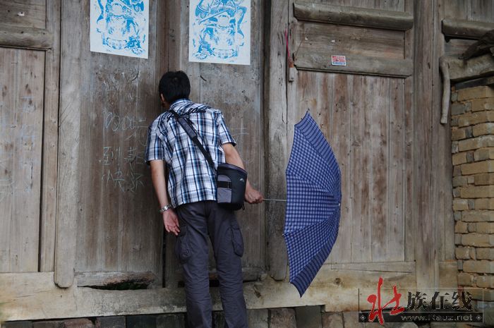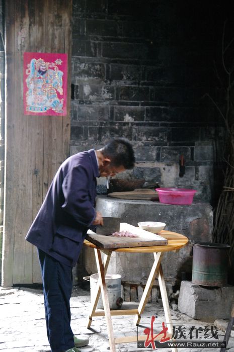 进了一家古宅,空空的,静悄悄的,本以为主人出去了,走到里面见有一大伯在切肉,孤独的身影。他见我们打招呼,抬头来看了一下,又低头只顾切肉。我们说进来看看您家的房子,他嗯了一声说看房子呀,抬头又看了一下我们,目光很友善,然后他又继续切肉,很专心地样子,好像刀子钝,吃力地切。王上去递烟,他接了放嘴里叼着也不点仍继续切肉,屋子静得发闷,我问大叔就你一人做饭吃饭呀,大伯不回答,说切肉切肉。屋子里被烟薰得黑黑的,光线从侧门斜照进来,大伯在逆光里稍驼的背上显出明显的线条,是个孤单的场景人像,我举起相机咔嚓了一张。