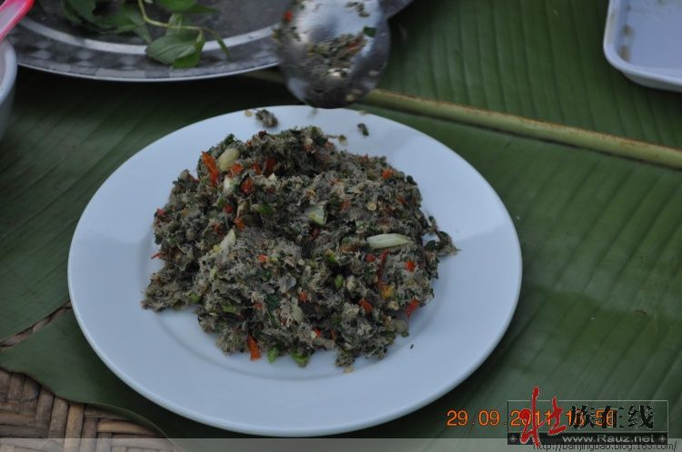 【解说】大头鱼喃咪意为用大头鱼做的蘸酱。傣家人喜欢用特有的佐料加上特制的方法,配上黄瓜、生菜等蘸食,吃法生态,味道鲜美。