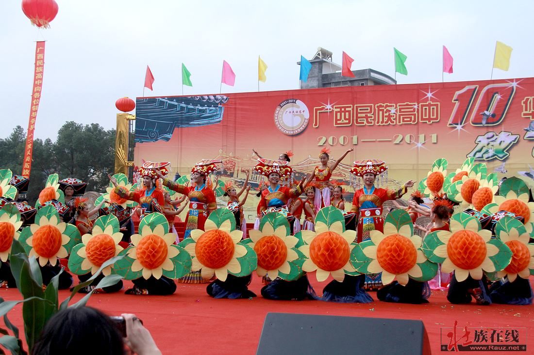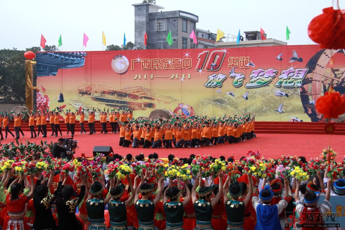 在广西民族高中建校10周年华诞庆典上,学校师生们举行大型民族歌舞表演,《青春盛典》、《金凤腾飞》、《欢乐校园》、《歌的家乡》、《放飞梦想》五个宏伟篇章,集中展现了广西民族高中的办学特色,素质教育的成果和师生们优秀的综合素质。同时,精彩的歌舞表演也表露出师生们对学校的浓浓祝福、对学校美好明天的憧憬,祝福学校的未来更加辉煌。