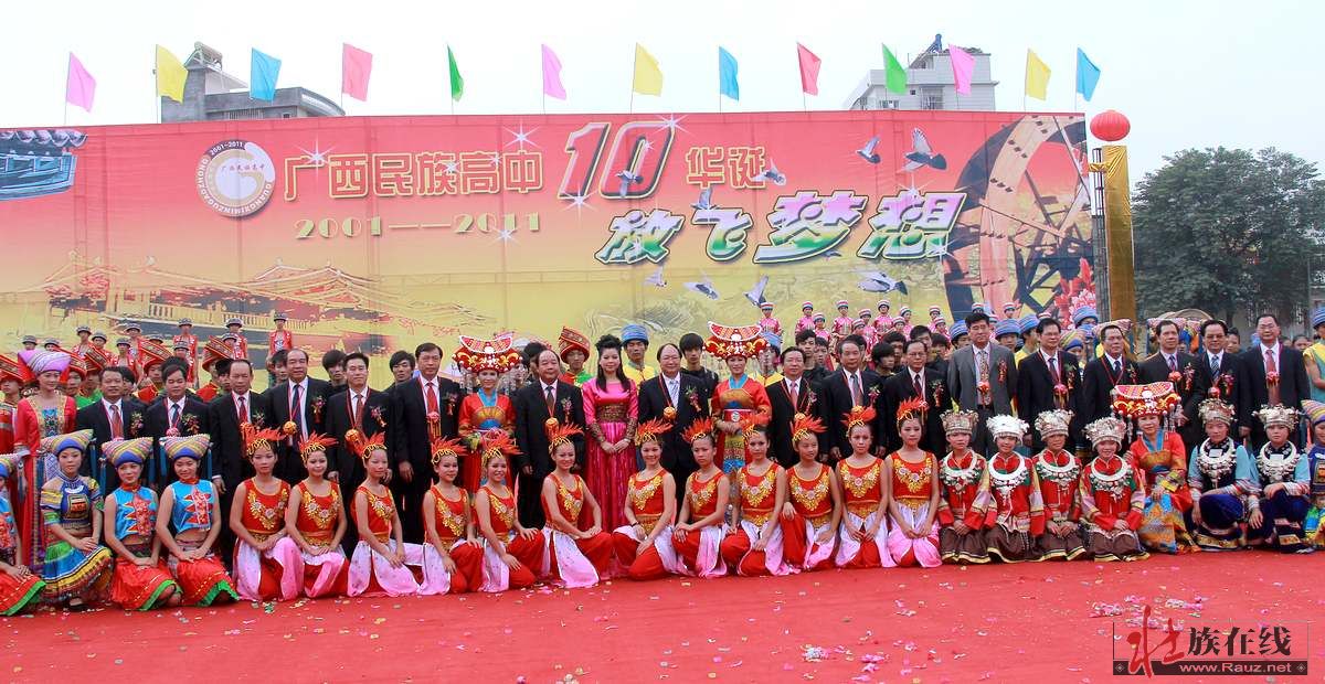 自治区政协副主席苏道俨、自治区民委主任卢献匾、武鸣县县长宋日正在庆典仪式上向广西民族高中建校10周年华诞表示祝贺希望广西民族高中继续认真贯彻落实党的民族教育政策,狠抓教育教学质量,为国家、社会培养出更多、更好的栋梁之才。