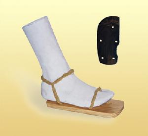 1、屐形设计趋于成熟,符合保护足部,便于行走的要求,长宽比例适中,略呈宽体型,底部前后均为削磨成弧形,使用时用柔性的绳子固定足部,而通过底部的绳子,恰好嵌入凹槽,避免与地面接触,增加了使用寿命,就象今天宽松式保健鞋,穿着舒适方便,行动灵活自如,又坚固耐用。