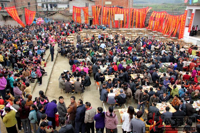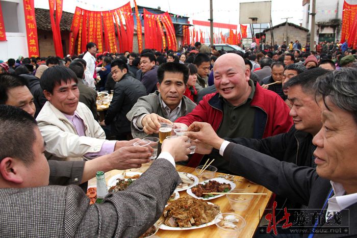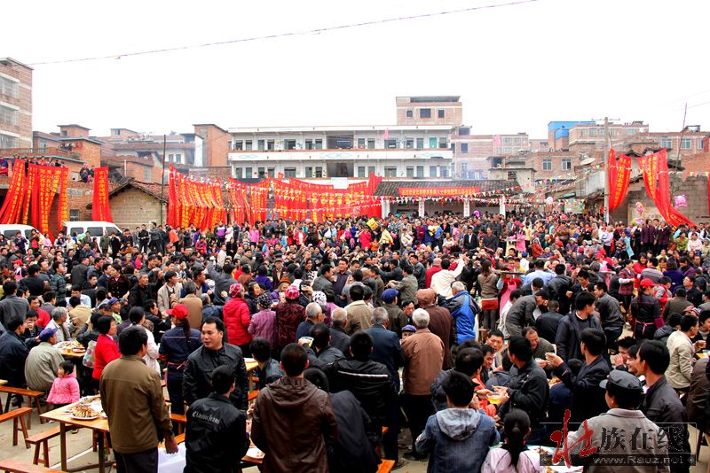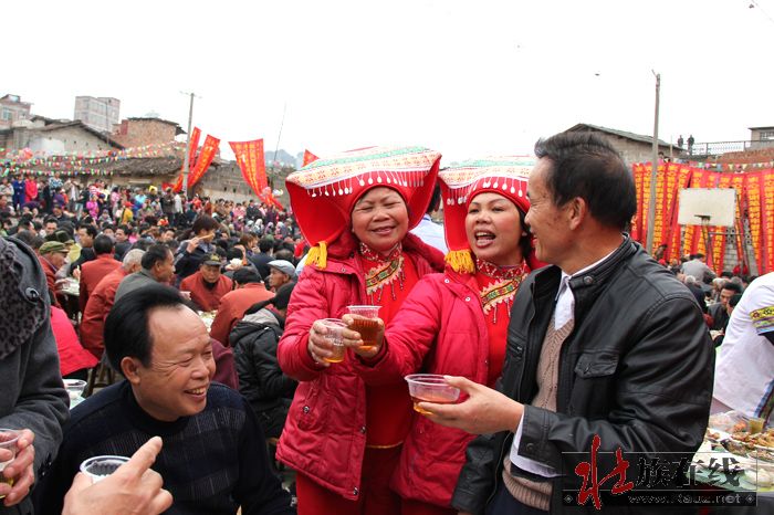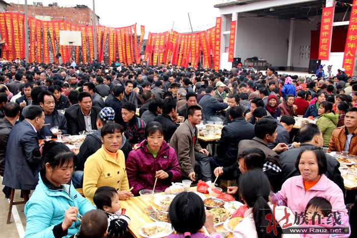 当天下午,260台的壮家宴在村戏台前的灯光球场开台,把壮族人民勤劳、纯朴、好客、热情的民风一统展示,让大家在开开心心、热热闹闹中度过一个美好的村节。邻村来赶庙会的渌口村村民黄东汉说:今年赖坡村村节场面大,很热闹,有看点,有玩头,来赶庙会的村民很开心,这样可以把民族文化仪式传下去,全村也就很团结,很有凝聚力。希望赖坡村继续办好传统节日,让壮村群众平安幸福,这也是广大壮族群众的共同愿望。”