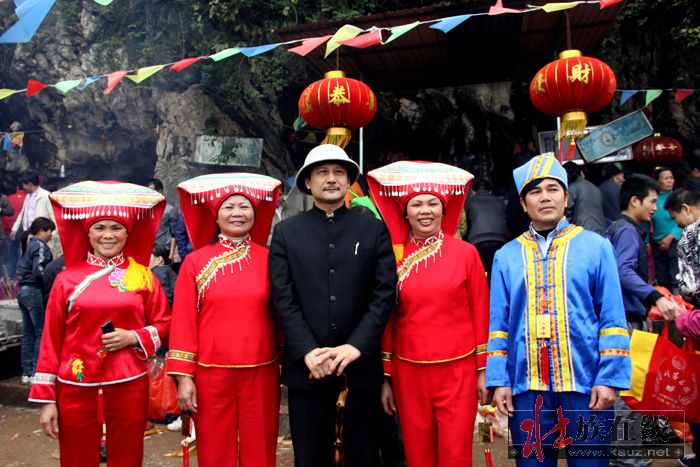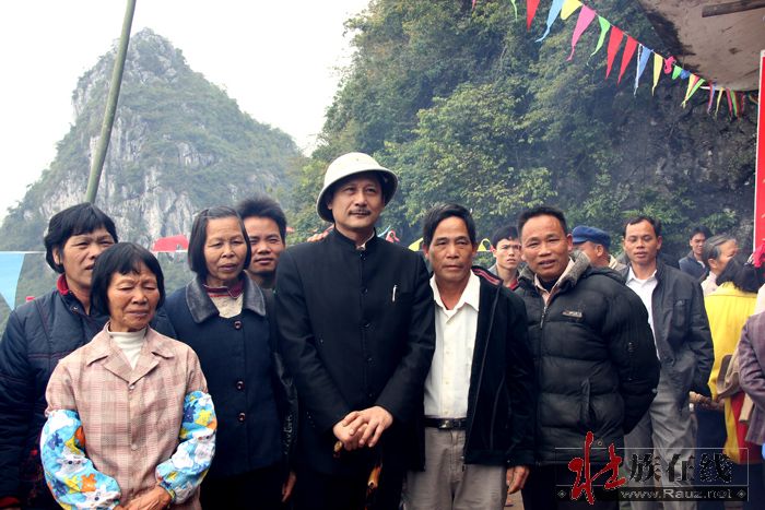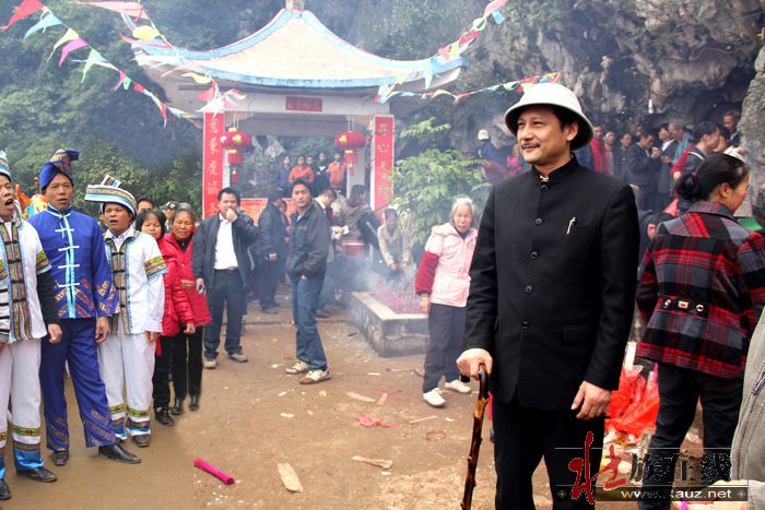 曾扮演孙中山的特型演员韦智,书画大师张美中和文化界的朋友 当天也来到赖坡村,游览武鸣龙角山风光。当特型演员“孙中山”一出现在龙角山庙的石祖前时,全场沸腾起来,部分正在下山的群众又重新返回山上,要一睹“孙中山先生”的尊容,争相近距离与“伟人”亲近合影。得知书画大师张美中,是国际中国书画家交流促进会副秘书长、中国十大最具影响力书画家,作品被多家博物馆收藏并作为礼品赠送外国政要和国际友人,并与甘祥梦(甘圩人)有缘时,大家都开心的说:“名人来给龙角山增光彩了,欢迎两位名人大师到壮家做客!”当天,两位名人游览了龙角山及岩洞,观看了山下的龙师表演、山歌对唱和拜山祭祀民俗,在甘圩镇上品味了壮家特色菜,不断夸奖“壮族人民热情爱客,赖坡村民风纯朴,愿望美好,壮乡菜味道也好极了!”之后,书画大师张美中还到赖坡村看民俗表演,做客午人壮家宴。