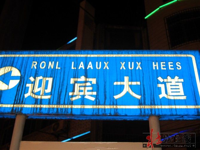 迎宾大道: Ronl Laaux Xux Hees---Roen Laux Cux (Coux) Hek. Ronl Laaux/Roen Laux: 大路,大道; Xux/Cux (Coux): 接; Hees/Hek: 客