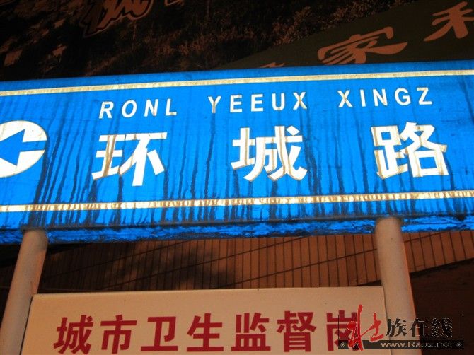 环城路: Ronl Yeeux Xingz---Roen Yeux (Heux) Cingz (Singz). Yeeux/Yeux (Heux): 环绕, 拼写法不一样,是方言差异的问题,有对应关系; Xingz/Cingz(Singz): 城