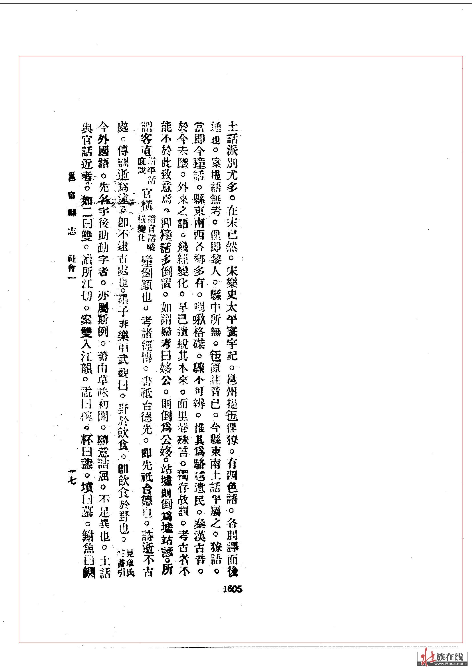 土话派别尤多。在宋已然。宋乐史太平寰宇记。邕州提迤俚獠。有四色语。各别译而后通也。案提语无考。俚即黎人。县中所无。迤原注音已。今县东南土话半属之。獠语。当即今獞话。县东南西各乡多有。啁啾格磔。骤不可辨。惟其为骆越遗民。秦汉古音。于今未坠。外来之语。几经变化。早已遗蜕其本来。而里巷殊言。独存故训。考古者不能不于此致意焉。