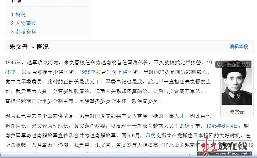 朱文晋(1910-1983),越南共产党老党员、越南人民军华裔高级将领。本姓周,是个侬族人,和我们的壮族是同一个民族,祖籍中国广西省龙州县。1917年移民至越南,并于成年后投军对抗日军。1944年12月22日,印度支那共产党集中自己所掌握的大部分武装力量,成立了由游击队骨干组成的越南解放军宣传队,为将来组建主力部队奠定了基础。