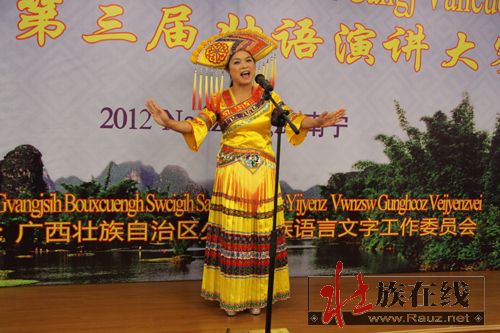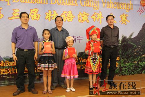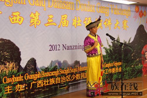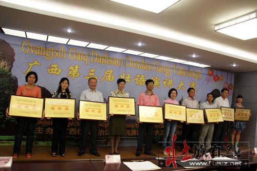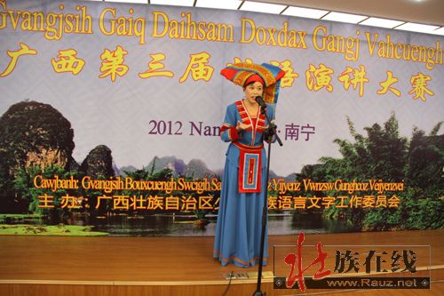 为了迎接党的十八大胜利召开和纪念国务院颁布《壮文方案》55周年,1027,自治区民语委在南宁举办广西第三届壮语演讲大赛。来自全区10个市代表队的30名选手参加了此次比赛。经过激烈角逐,河池市代表队的罗孟佼、韦月娟及南宁市代表队的罗樱华3名参赛选手获得一等奖,其他27位选手分别获得二、三等奖和优秀奖。自治区民语委副主任杨启标、王泉忠,巡视员覃耀武观看了比赛并给获奖选手颁奖。