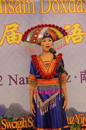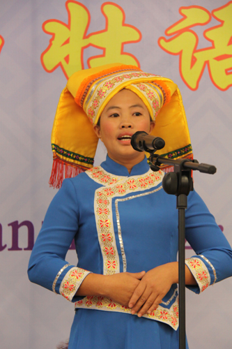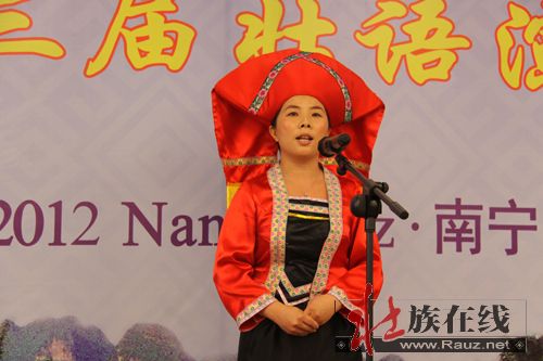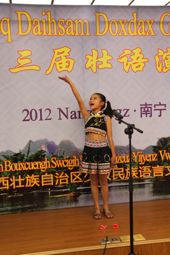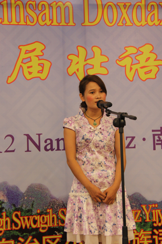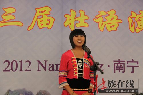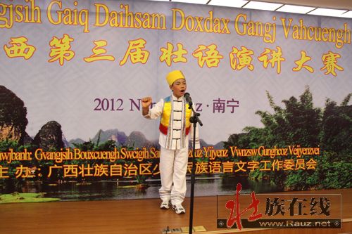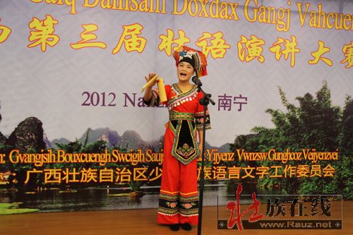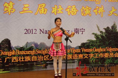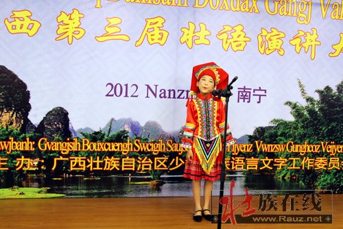 Daengngoenz le, menh menh byenz hwnj bya le, ciuq daengz Bouxcuengh lwgnyez le, cienz ndang raeujrubrub le, cienz ndang raeujrubrub le! ”伴随着清脆响亮的歌声,本次比赛年龄最小的选手罗樱华走上舞台,开始了她极富情感的《壮族文化代代传》的演讲。小选手罗樱华年仅10岁,来自武鸣县太平镇庆乐小学,她以标准、娴熟的壮语语言,向现场的观众们娓娓道来。她在演讲中说到,壮文和壮族山歌是壮族的优秀文化,为了让壮族文化能够薪火相传,让更多的人感受到壮族文化的魅力,她要努力学好壮文和汉语……观众的掌声热烈响起,为小选手精彩的演讲而鼓掌,为小选手立志传承壮族文化的理想而喝彩。