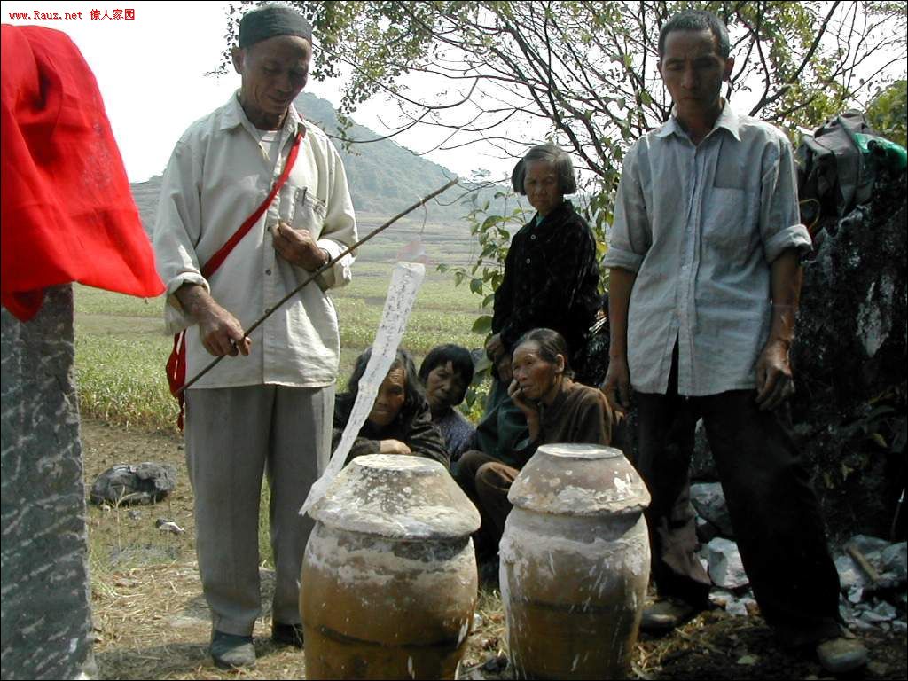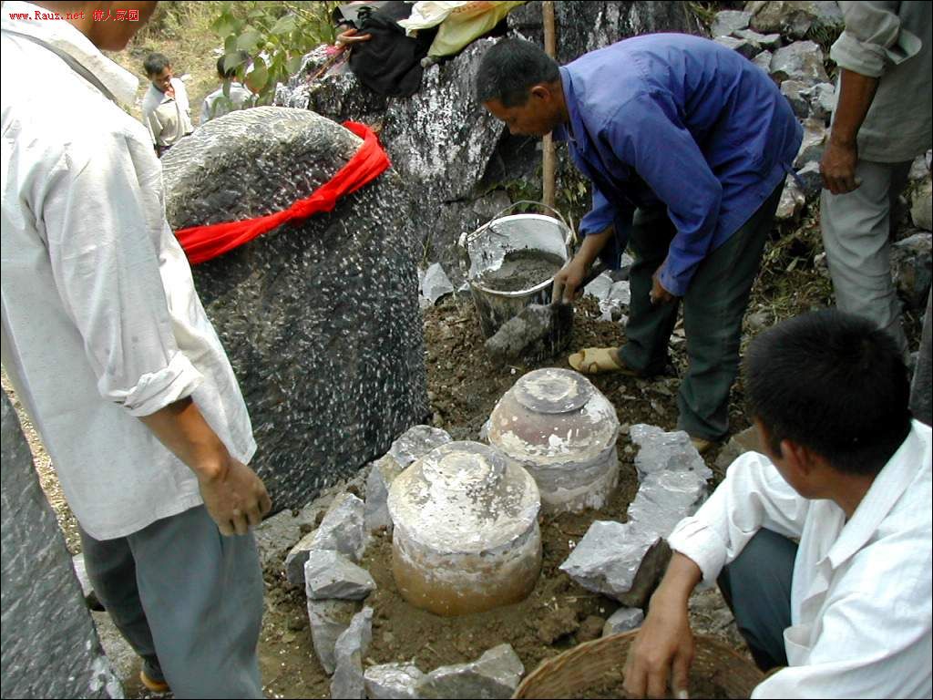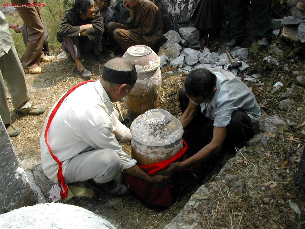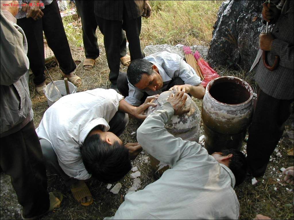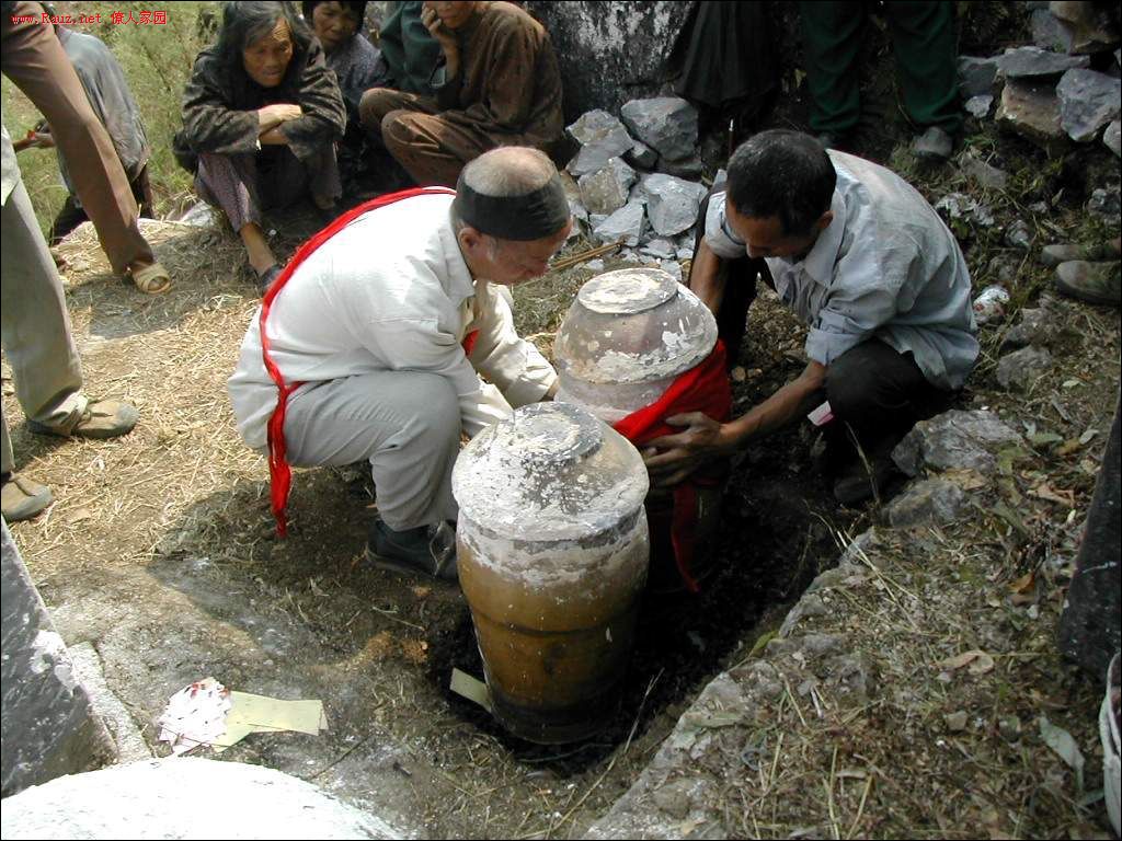 接着道公和本家用红布包着龙坛放入穴中,顺序是先男后女,男左女右,男高女低。
