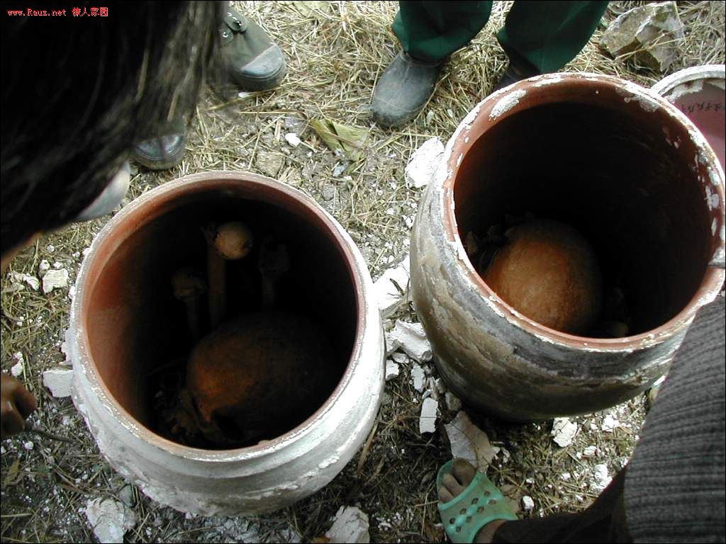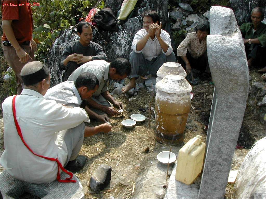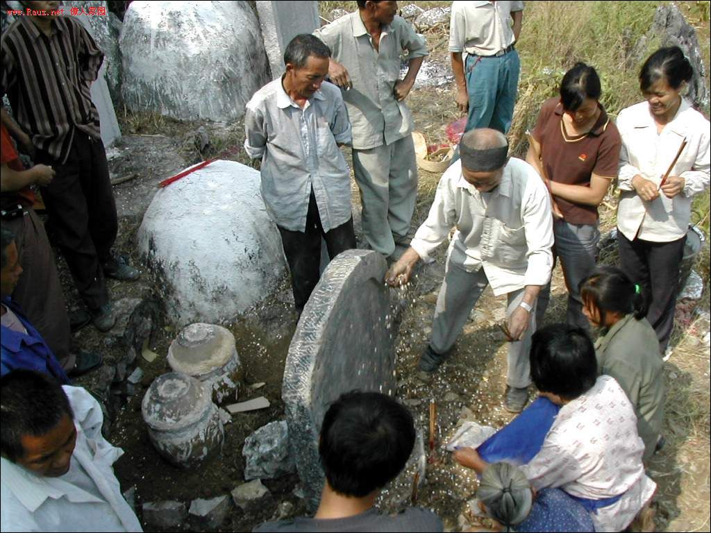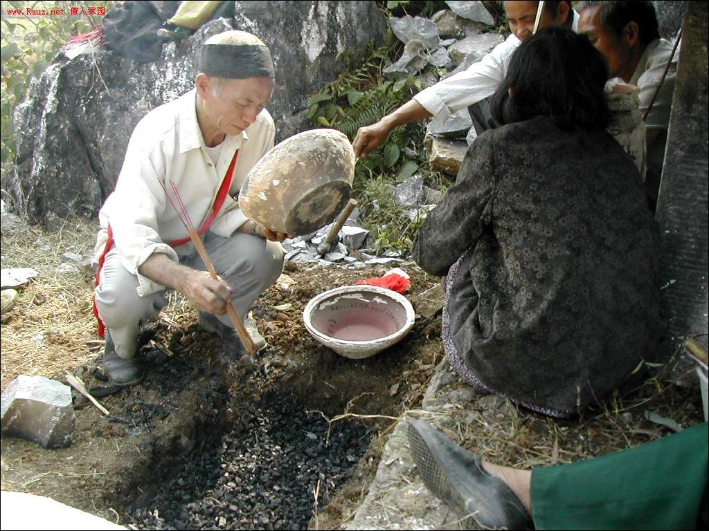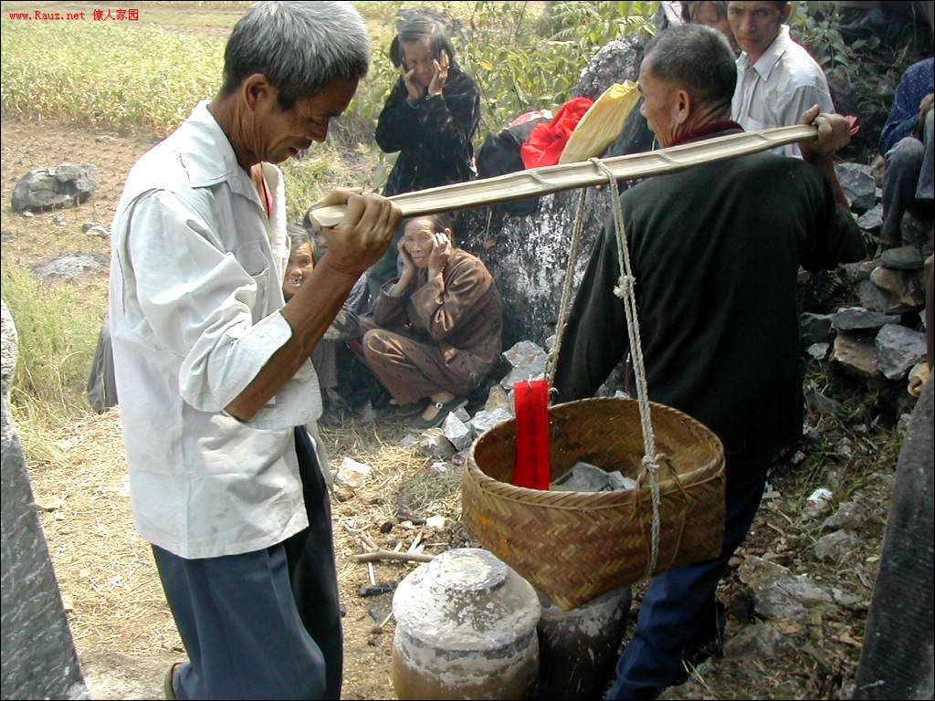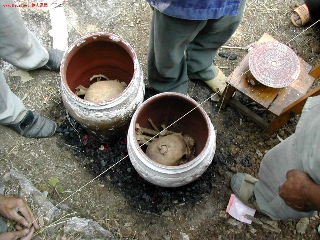 接着道公和本家用红布包着龙坛放入穴中,顺序是先男后女,男左女右,男高女低。
