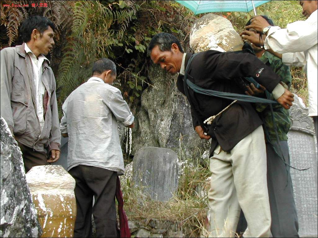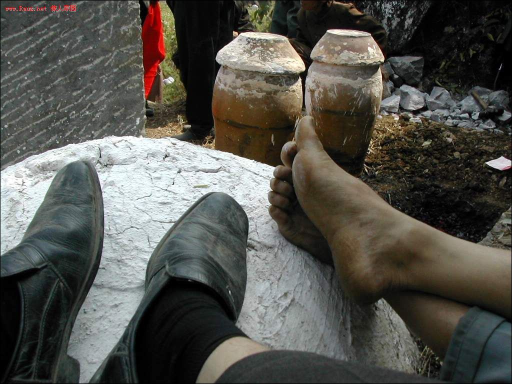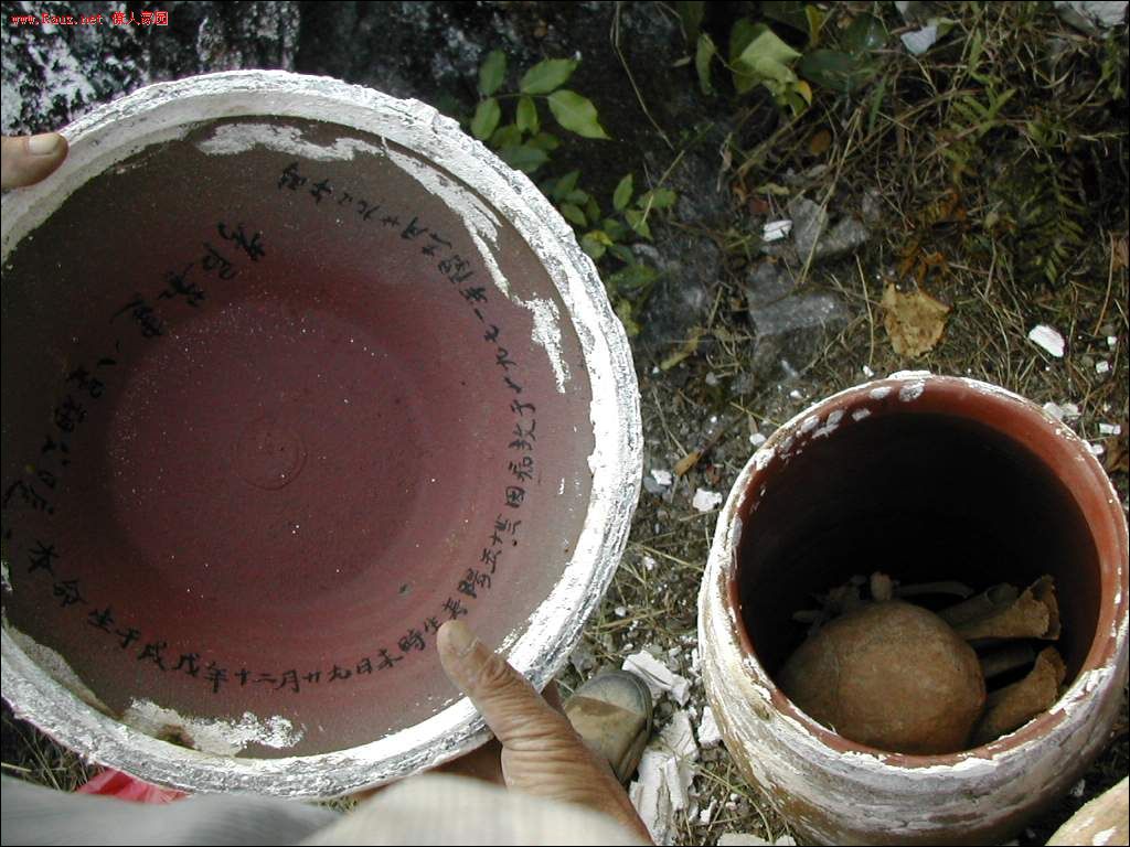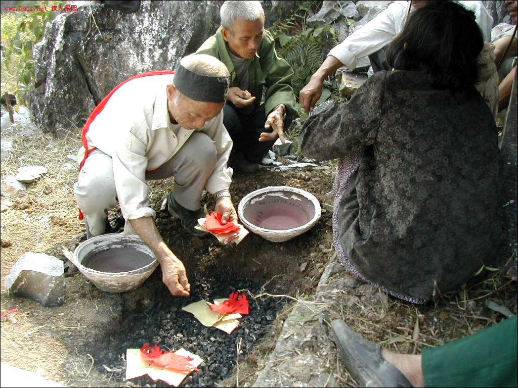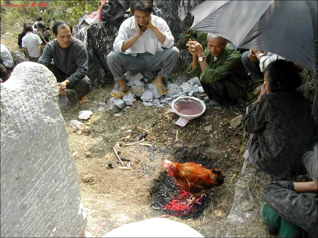 接着道公和本家用红布包着龙坛放入穴中,顺序是先男后女,男左女右,男高女低。