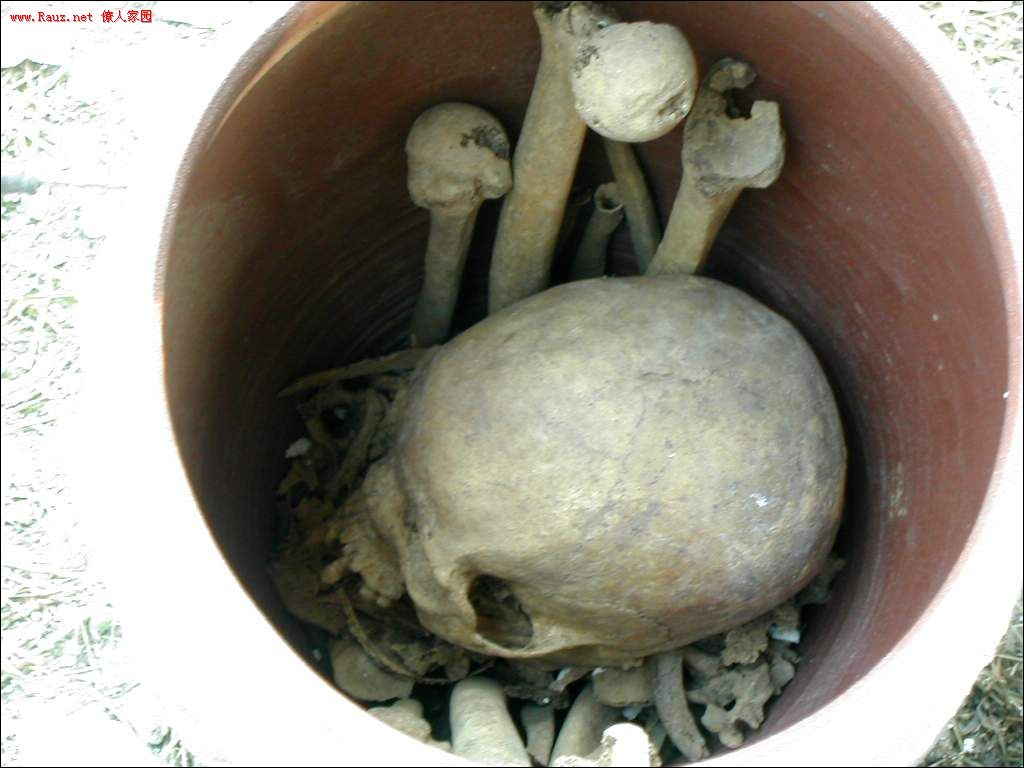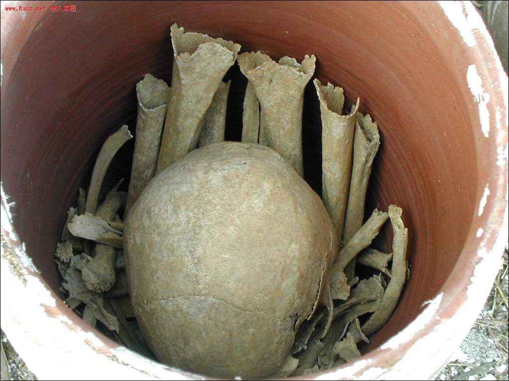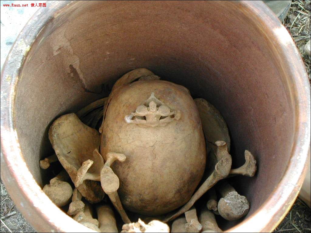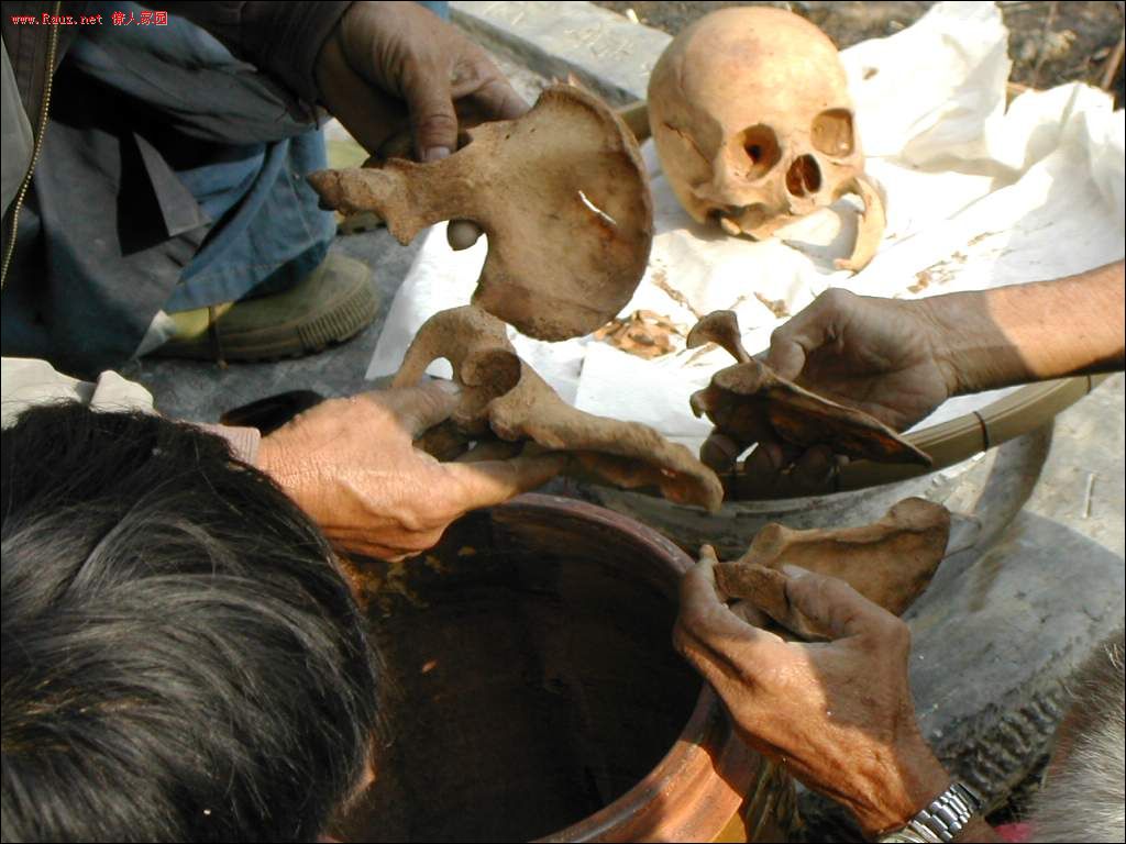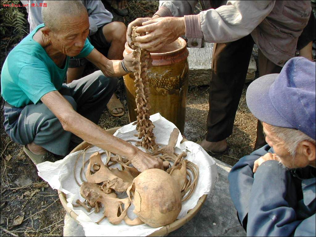 然后再把骨头重新装到坛子里,先串起脊椎骨,其余各骨依次放入